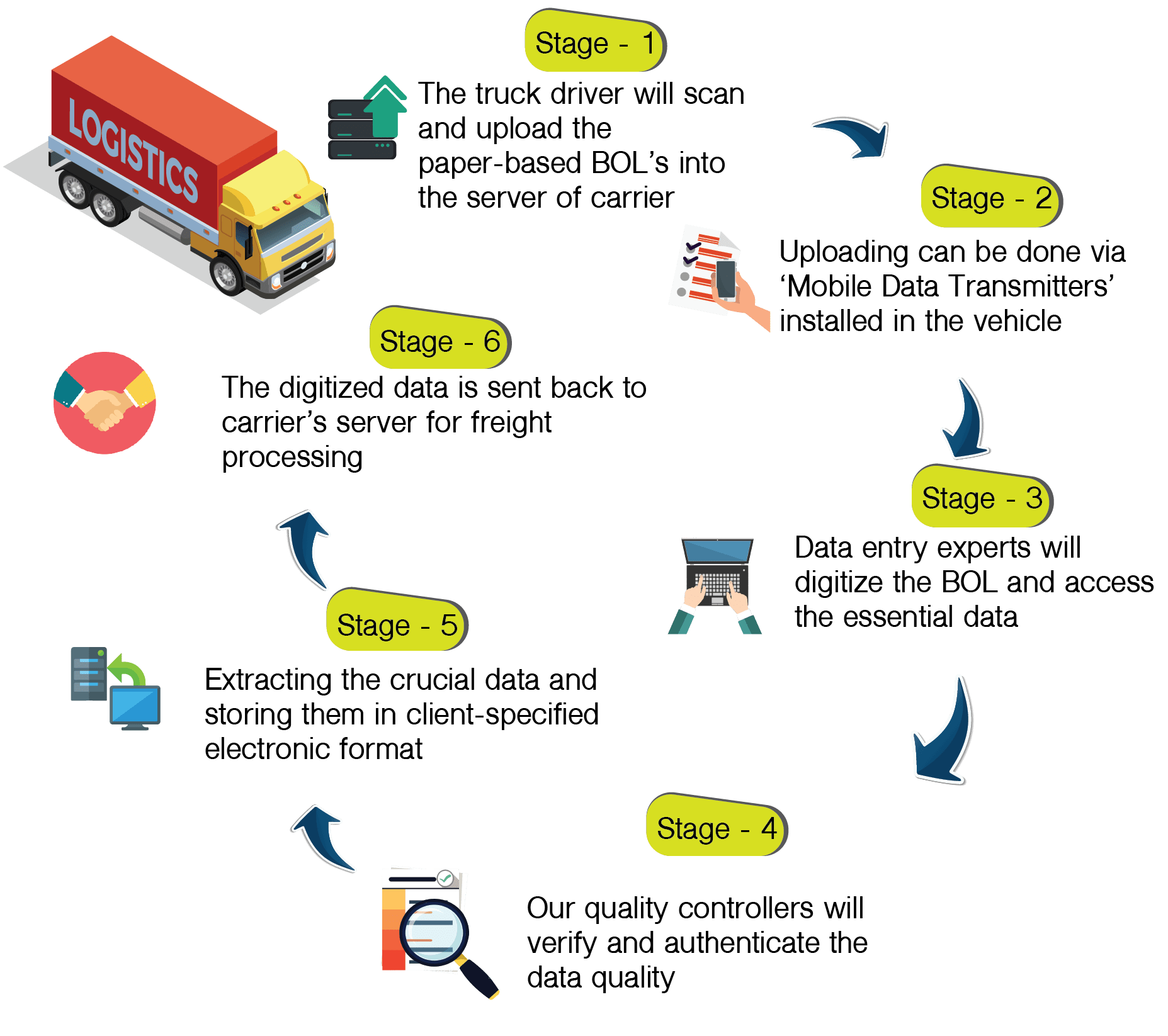 We ensure to maintain a frequent communication with our client so as to deliver a customer-satisfied result on time. While executing the road freight processing of BOL, we ensure to maintain the accuracy and preciseness of the result along with the comprehensive data security measures. We make the optimal utilization of the advanced and state-of-the-art technology to achieve the desired output.